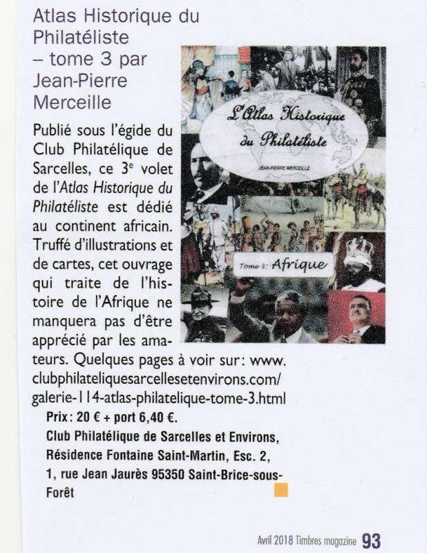 Timbres Magazine N° 199 d'Avril 2018 annonce la parution du tome 3 de la collection " l'Atlas Historique du Philatéliste " concernant l'Afrique de notre ami J-P; Merceille.