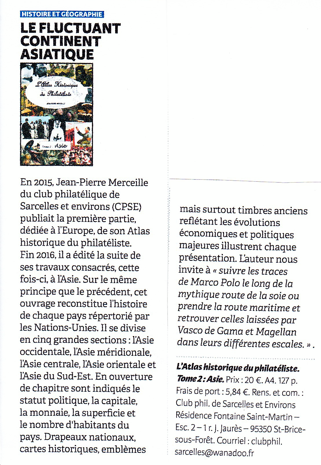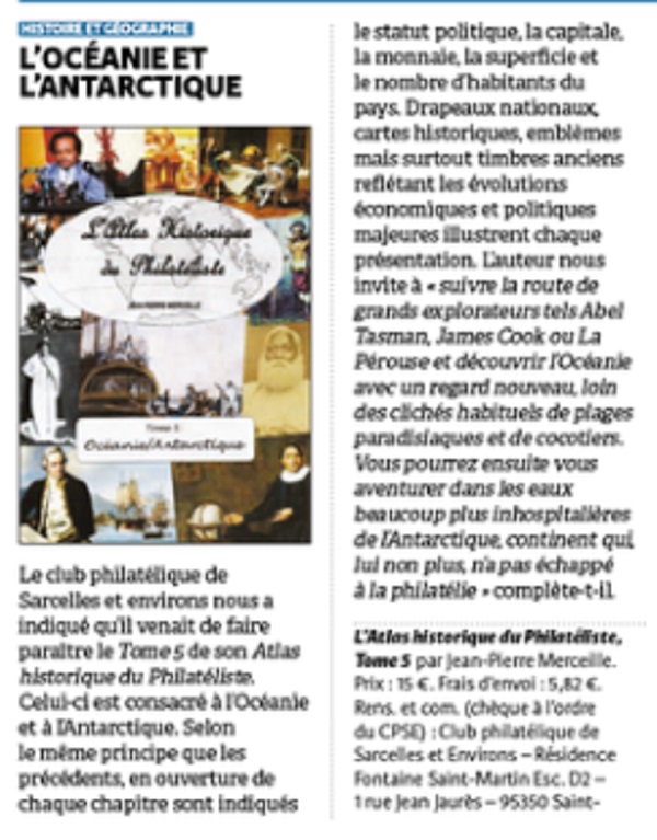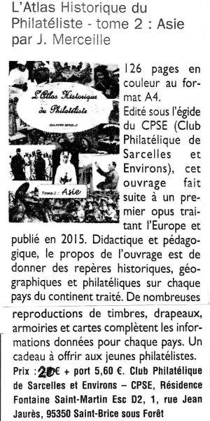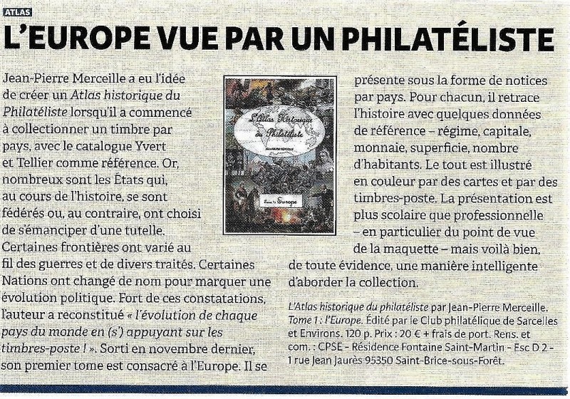 Le N°1902 de "L'Echo de la Timbrologie" paru en Janvier 2016 annonçait ainsi le tome 1 de "l'Atlas du Philatéliste" réalisé par notre camarade J.-P. Merceille et publié par le "C.P.S.E." :